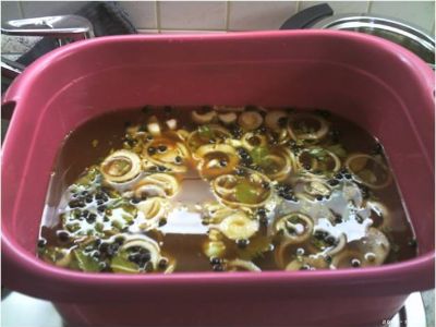 In ca. 6 bis 8 Litter Wasser werden die 400 g Salz aufgelöst. Die andereren Gewürzte werden in 1 Liter Wasser aufgelöst und ca. 1 Minute aufgekocht und nach der Abkühlung, der Lake, kommen die Forllen dazu.